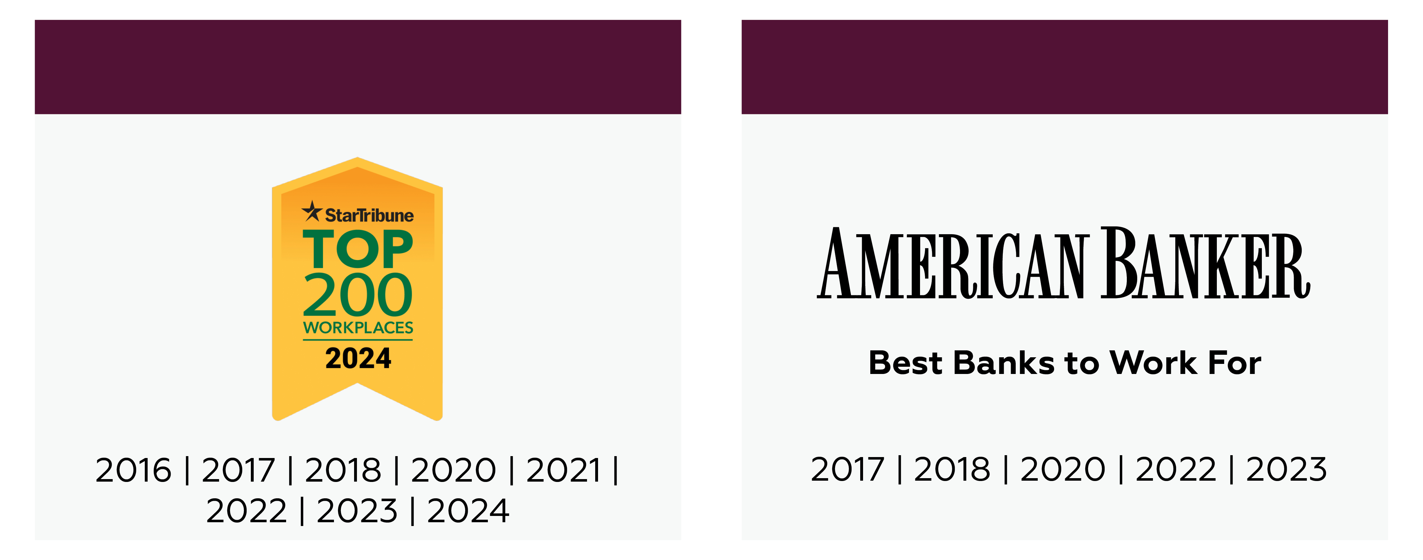 Our workplace culture has been recognized as a “Top Workplace” by the Star Tribune and as a “Best Bank to Work For” by American Banker.